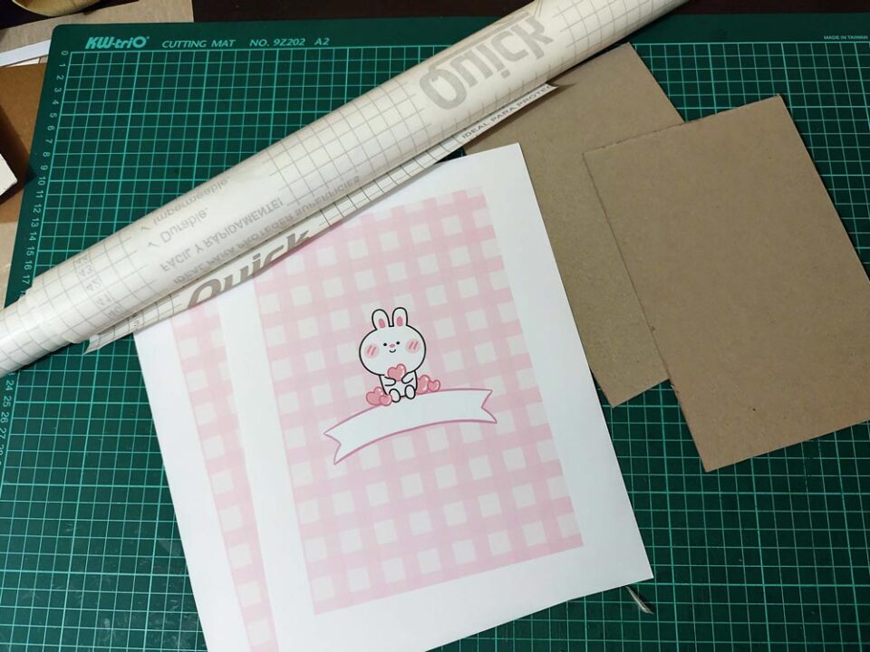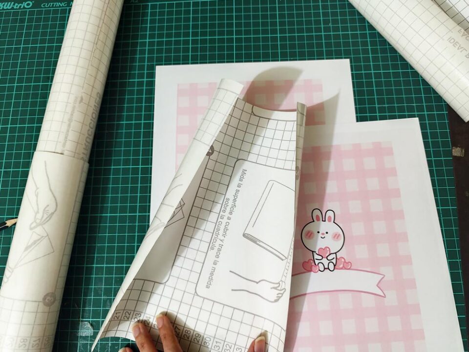 Debemos imprimir nuestras portadas por aparte, en este casi las imprimimos en papel sticker (para facilitar el pegado pero también lo puedes hacer en opalina y pegarlo con colbón)y les pegamos el papel contact encima antes de cortar. Una vez hecho esto procedemos a pegarlas en el cartón piedra, ¡siempre recuerda dejar un margen!