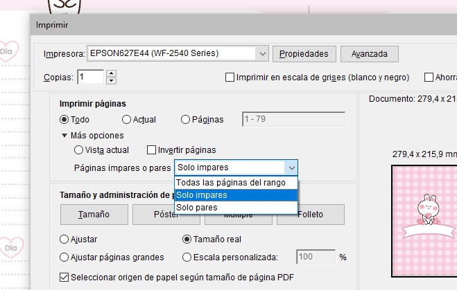 Ya que mi impresora no imprime doble cara, siempre elijo imprimir las impares 😊, luego de que salgan impresas el siguiente paso es voltearlas manualmente e imprimir las pares.